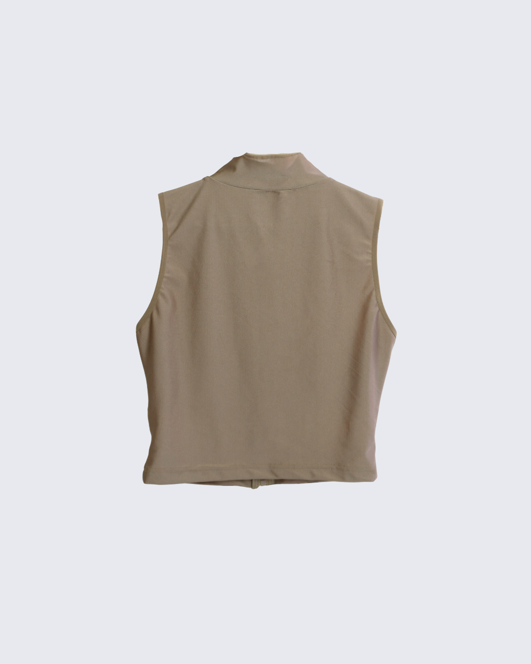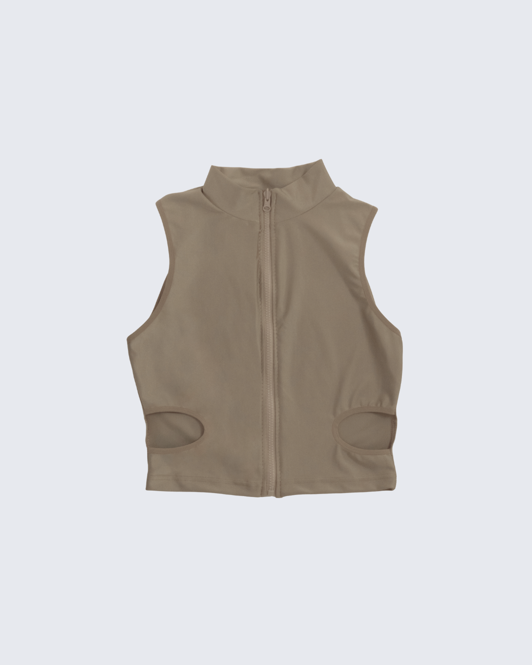 Licra gruesa con aberturas y cremallera metálica hasta el cuello.